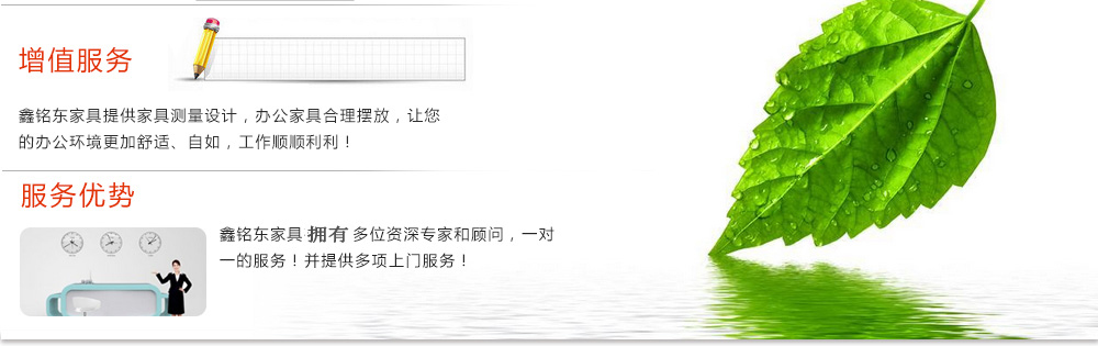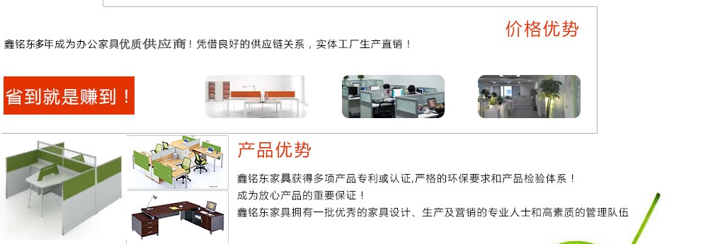 深圳市鑫銘東家具有限公司深圳市鑫銘東家具有限公司專業(yè)銷售各類辦公家具!產(chǎn)品涉及多種系列,如:班臺、班椅、屏風(fēng)、會議桌、會議椅、辦公沙發(fā)、茶幾、辦公桌、文件柜、電腦桌椅、各式餐臺、餐椅、書柜等辦公家具。 鑫銘東家具擁有一批優(yōu)秀的家具設(shè)計、生產(chǎn)及營銷的專業(yè)人士和高素質(zhì)的管理隊伍。銘東家具以"先難后易"之戰(zhàn)略,在產(chǎn)品結(jié)構(gòu)、產(chǎn)品質(zhì)量及服務(wù)水平方面,均推陳出新,力求完善,精益求精。使我們的產(chǎn)品質(zhì)量保持在國內(nèi)外家具潮流的先進(jìn)水平,力求滿足客戶的特殊需求。鑫銘東家具多年來致力于環(huán)保、實(shí)用家具的設(shè)計與開發(fā),集生產(chǎn)、銷售、服務(wù)于一體。本著"以人為本"的設(shè)計理念,大量開發(fā)符合人體工程學(xué)的各種產(chǎn)品,以"誠信為本"的質(zhì)量方針,真材實(shí)料,認(rèn)認(rèn)真真做產(chǎn)品,實(shí)實(shí)在在做人。鑫銘東家具更致力于創(chuàng)造"零維修率"的制造境界,實(shí)現(xiàn)"沒有維修的服務(wù)才是最好服務(wù)"的口號》了解更多 |